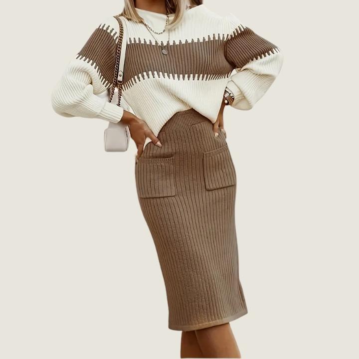 Stay stylish and cozy this season with this high-neck pullover and skirt two-piece set. Crafted from soft viscose knit fabric, it features an elegant color block design that adds depth and sophistication to your look. The high-neck pullover pairs perfectly with the matching split midi skirt for a flattering, coordinated silhouette. Ideal for fall and winter, this outfit is perfect for work, brunch, or chic weekend outings.